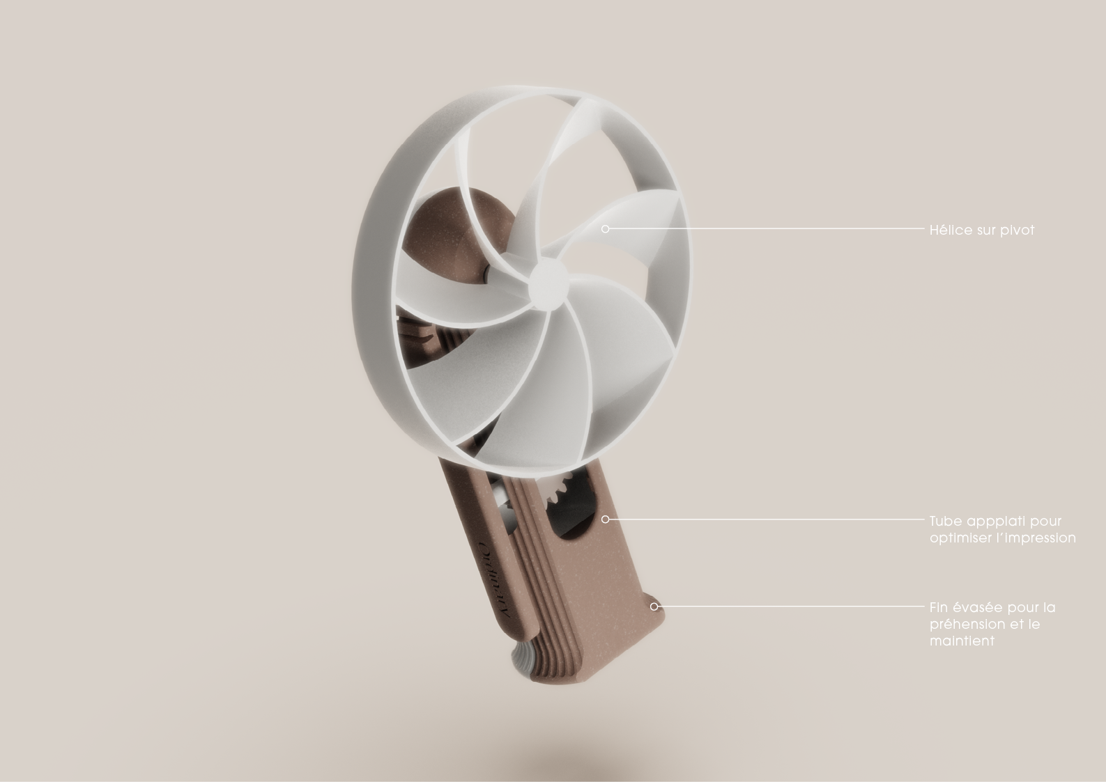 A mi-chemin entre ventilateur fixe et éventail, il est l’exemple de compliant mecanism qui permettent d’améliorer un objet à mécanique traditionnelle tel que l’éventail tout en gardant la dimension compact et portable de l’objet.