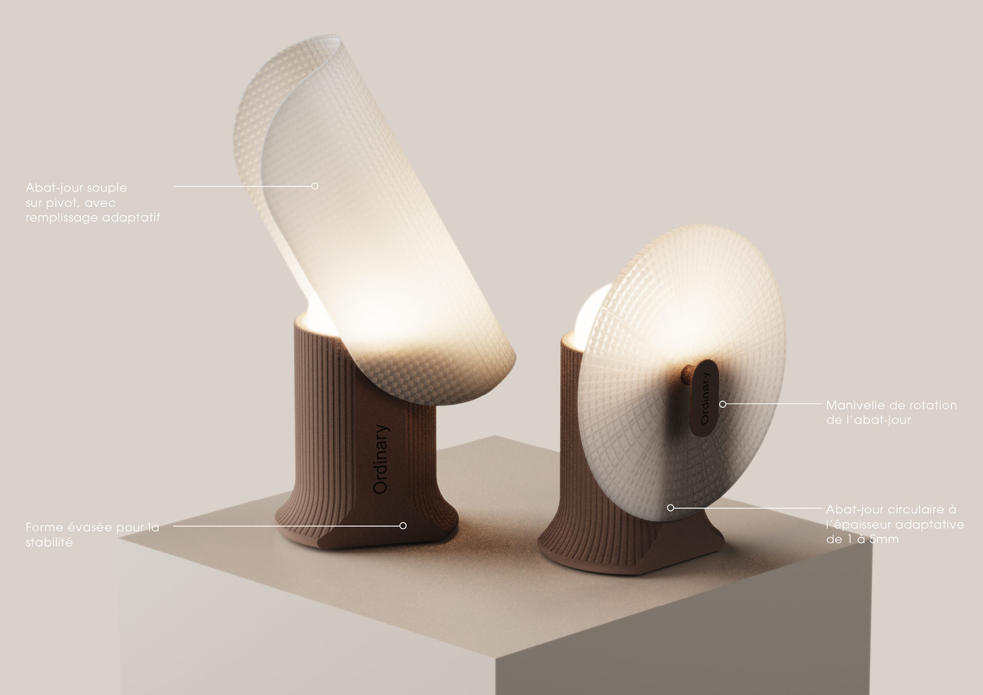 Les deux systèmes d’abat-jour fonctionnent comme un variateur Low Tech avec lequel on peut expérimenter différents jeux de lumière grâce aux nombreux motifs de remplissage d’impression 3D.